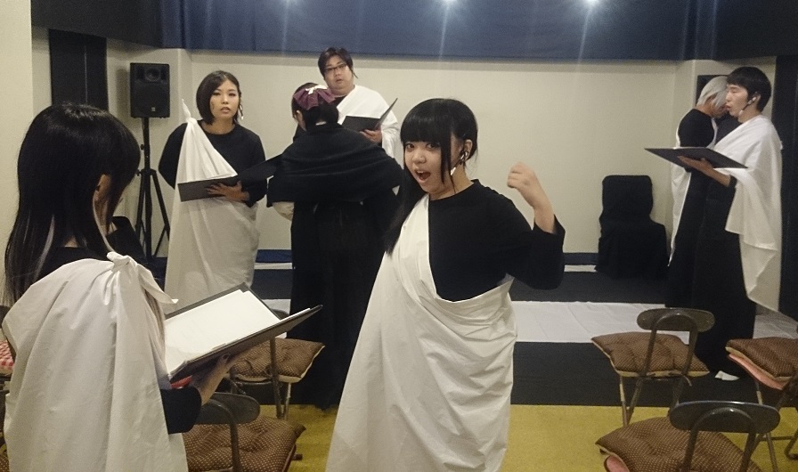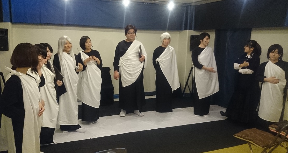 「えー、今回初出演させていただきます、清水と申します。初参戦なのに、重要な神の役をいただきまして、光栄の至りです。見に来ていただいた皆様に、楽しんでいただけるよう、全力で頑張ります!宜しくお願いします!」