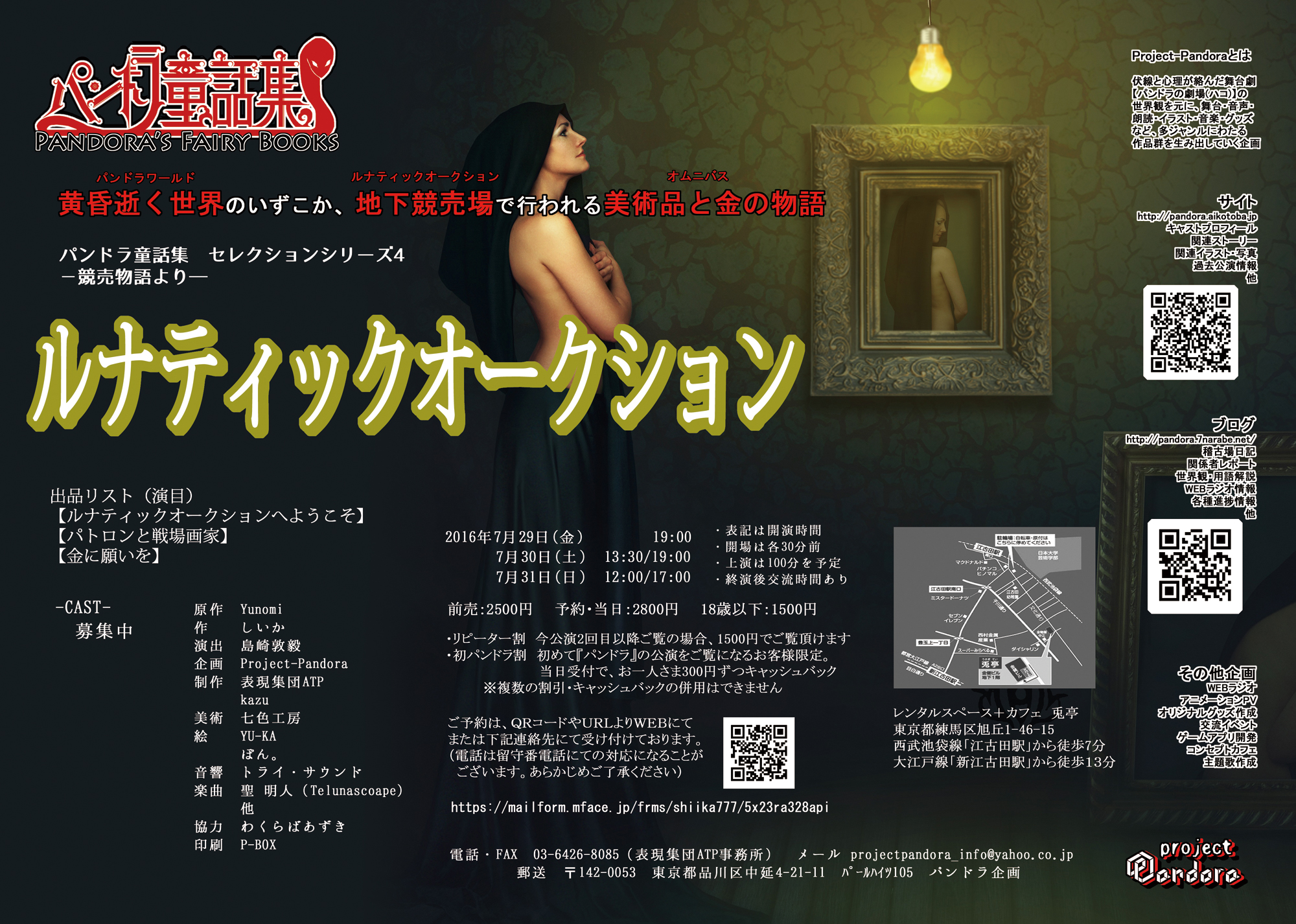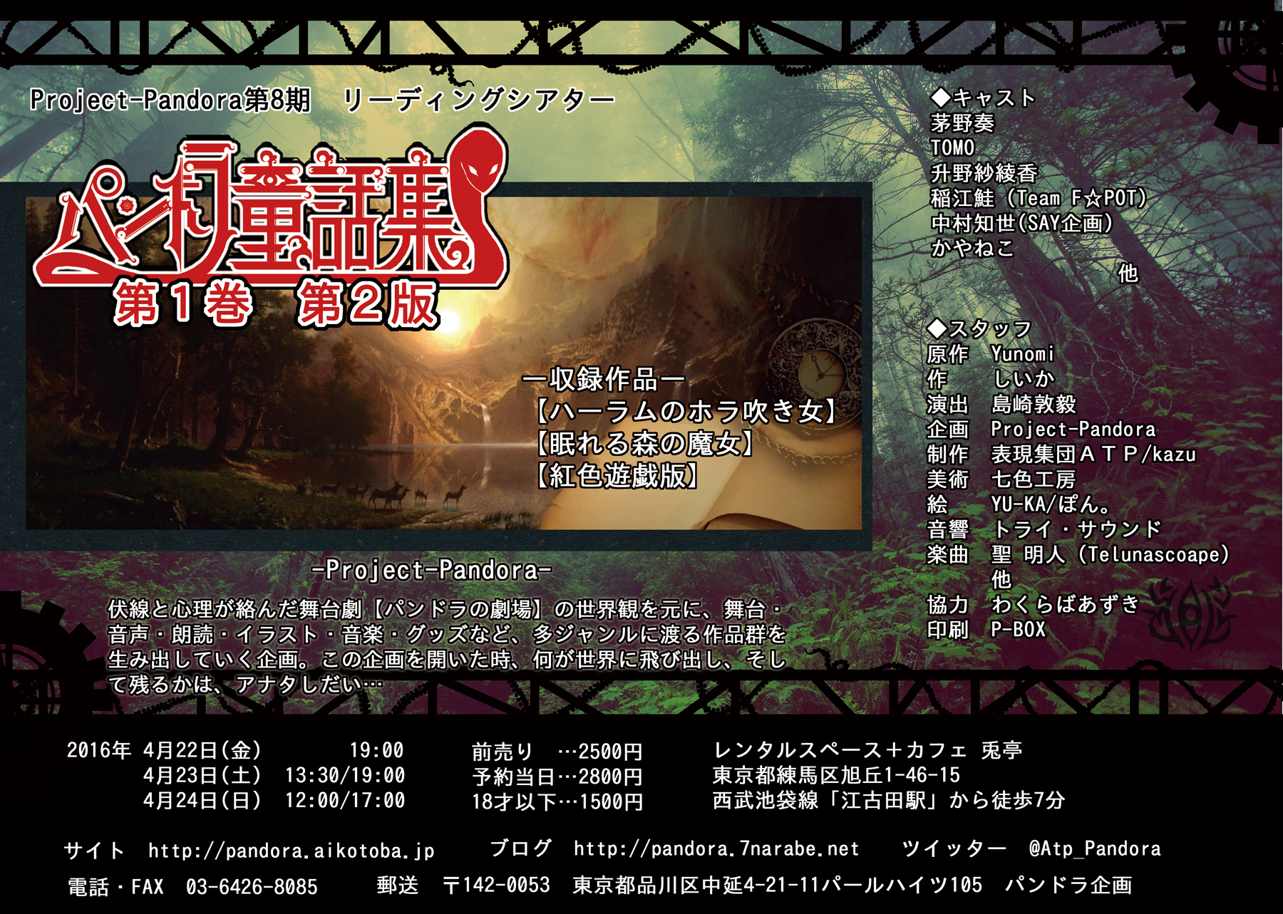 伏線と心理が絡んだ舞台劇【パンドラの劇場】の世界観を元に、舞台・音声・朗読・イラスト・音楽・グッズなど、多ジャンルに渡る作品群を生み出していく企画。この企画を開いた時、何が世界に飛び出し、そして残るかは、アナタしだい…