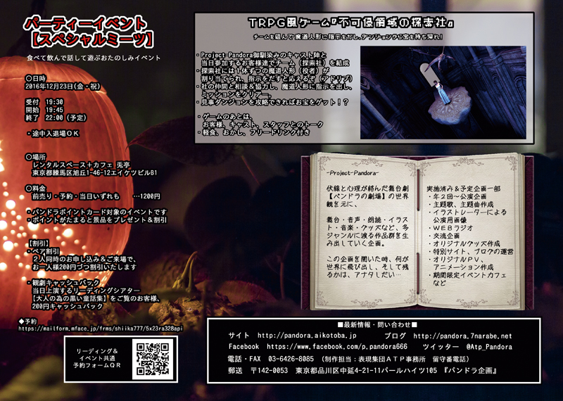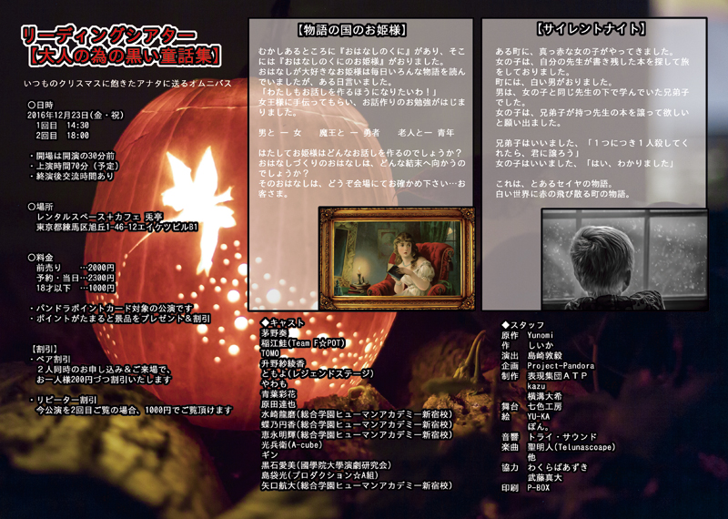 粒選り童話集2 2016/12/21 (再)特別企画 リーディングシアター&イベント 大人の為の黒い童話集 ※以前の情報から、一部訂正が御座います。 Project-Pandora特別企画 リーディングシアター&イベント クリスマスにアナタにお送りする、黒く切なく美しい物語と、食べて飲んで話して遊ぶパーティーイベント ―リーディングシアター【大人の為の黒い童話集】― †演目† 【物語の国のお姫様】 むかしあるところに『おはなしのくに』があり、そこには『おはなしのくにのお姫様』がおりました。 おはなしが大好きなお姫様は毎日いろんな物語を読んでいましたが、ある日言いました。 「わたしもお話しを作るほうになりたいわ!」 女王様に手伝ってもらい、お話作りのお勉強がはじまりました。 男と ― 女 魔王と ― 勇者 老人と― 青年 はたしてお姫様はどんなお話しを作るのでしょうか? おはなしづくりのおはなしは、どんな結末へ向かうのでしょうか? そのおはなしは、どうぞ会場にてお確かめ下さい…お客さま。 【サイレントナイト】 ある町に、真っ赤な女の子がやってきました。 女の子は、自分の先生が書き残した本を探して旅をしておりました。 町には、白い男がおりました。 男は、女の子と同じ先生の下で学んでいた兄弟子でした。 女の子は、兄弟子が持つ先生の本を譲って欲しいと願い出ました。 兄弟子はいいました、「1つにつき1人殺してくれたら、君に譲ろう」 女の子はいいました、「はい、わかりました」 これは、とあるセイヤの物語。 白い世界に赤の飛び散る町の物語。 〇日時 2016年12月23日(金・祝) 1回目 14:30 2回目 18:00 ・開場は開演の30分前 ・上演時間70分(予定) ・終演後交流時間あり 〇場所 レンタルスペース+カフェ 兎亭 東京都練馬区旭丘1-46-12エイケツビルB1 〇料金 前売り …2000円 予約・当日…2300円 18才以下 …1000円 ・パンドラポイントカード対象の公演です ・ポイントがたまると景品をプレゼント&割引券になります 【割引】 ・ペア割引 2人同時のお申し込み&ご来場で、お一人様200円づつ割引いたします ・リピーター割引 今公演を2回目ご覧の場合、1000円でご覧頂けます ―パーティーイベント【スペシャルミーツ】― 食べて飲んで話して遊んぶおたのしみイベント。 ・TRPG風ゲーム『不可侵領域の探索社』 チームを組んで魔道人形に指示をだし、ダンジョンから宝を持ち帰れ ・お客様、キャスト、スタッフとのトーク ・軽食、おかし、フリードリンク付き 〇日時 2016年12月23日(金・祝) 受付 19:30 開始 19:45 終了 22:00(予定) ・途中入退場OK 〇場所 レンタルスペース+カフェ 兎亭 東京都練馬区旭丘1-46-12エイケツビルB1 〇料金 前売り・予約・当日いずれも …1200円 ・パンドラポイントカード対象のイベントです ・ポイントがたまると景品をプレゼント&割引券になります 【割引】 ・ペア割引 2人同時のお申し込み&ご来場で、お一人様200円づつ割引いたします ・観劇キャッシュバック 当日上演するリーディングシアター【大人の為の黒い童話集】をご覧のお客様、200円キャッシュバック ◆予約 予約フォームでのお申し込みは、定員に達した為終了いたしました ※当日券のご用意が出来た際は、Twitterを中心に情報公開いたします ◆キャスト 茅野奏 稲江鮭(Team F☆POT) TOMO 升野紗綾香 ともよ(レジェンドステージ) やわも 青葉彩花 原田達也 水崎龍磨(総合学園ヒューマンアカデミー新宿校) 蝶乃円香(総合学園ヒューマンアカデミー新宿校) 恵永明輝(総合学園ヒューマンアカデミー新宿校) 光兵衛(A-cube) ギン 黒石愛美(國學院大學演劇研究会) 島袋光(プロダクション☆A組) ※出演を予定していました矢口航大は、スケジュールの都合の為降板となりました ◆スタッフ 原作 Yunomi 作 しいか 演出 島崎敦毅 企画 Project-Pandora 制作 表現集団ATP kazu 横溝大希 舞台 七色工房 絵 YU-KA ぽん。 音響 トライ・サウンド 楽曲 聖明人(Telunascoape) 他 協力 わくらばあずき 武藤真大 印刷 P-BOX ・・・・・・ -Project-Pandora- 伏線と心理が絡んだ舞台劇【パンドラの劇場】の世界観を元に、舞台・音声・朗読・イラスト・音楽・グッズなど、多ジャンルに渡る作品群を生み出していく企画。 この企画を開いた時、何が世界に飛び出し、そして残るかは、アナタしだい… ―実施済み&予定企画一部― ・年2回~公演企画 ・主題歌、主題曲作成 ・イラストレーターによる公演用画像 ・WEBラジオ ・交流企画 ・オリジナルグッズ作成 ・特別サイト、ブログの運営 ・オリジナルPV、アニメーション作成 ・期間限定イベントカフェ ・ゲームアプリ開発 など ◆連絡・問い合わせ 電話・FAX 03-6426-8085 郵送 〒142-0053 東京都品川区中延4-21-11パールハイツ105 パンドラ企画 メール projectpandora_info@yahoo.co.jp サイト http://pandora.aikotoba.jp ブログ http://pandora.7narabe.net ツイッター @Atp_Pandora Facebook https://www.facebook.com/p.pandora666