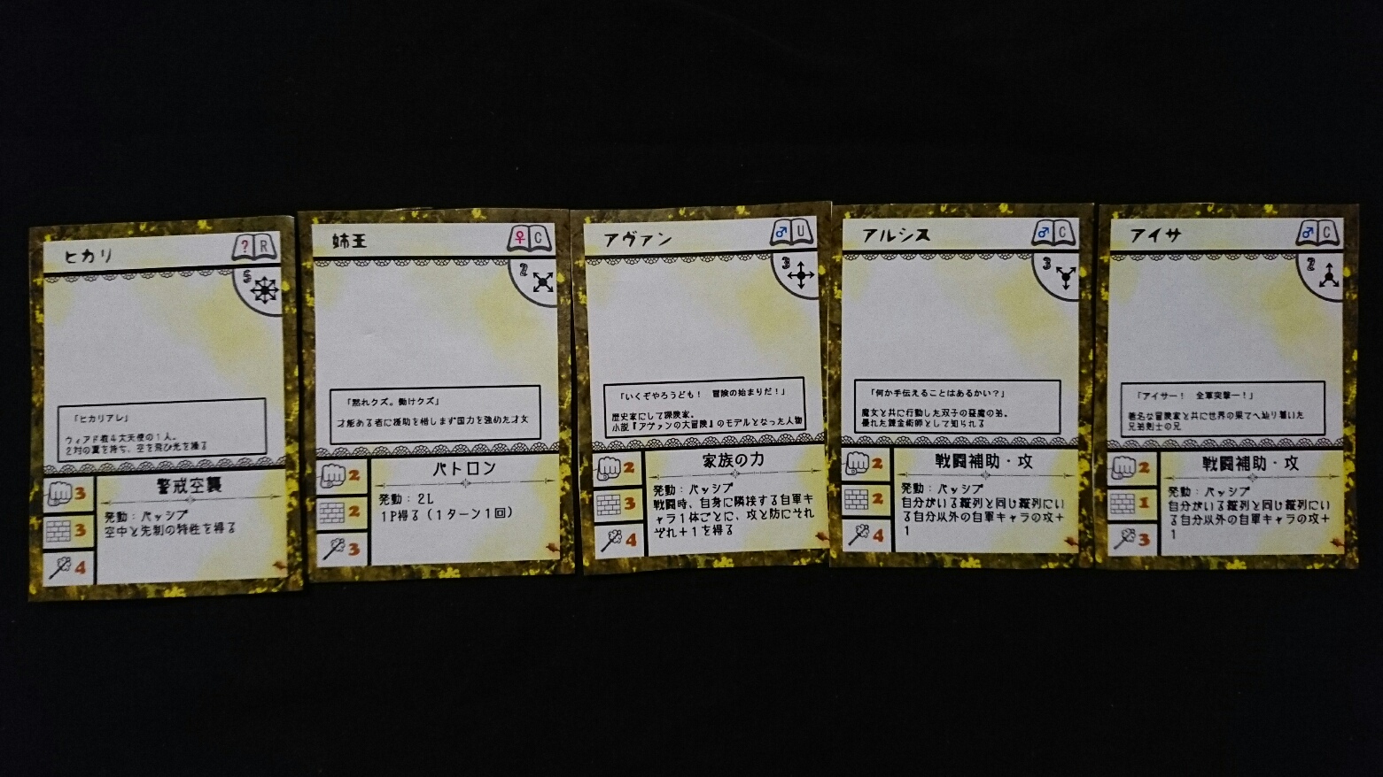 カードゲーム『Deus Ex Ark』 2017/11/21 DEA開発室より 第1回大会チャンピオンプロット 第1回DEA公式大会のチャンピオンである、やわも選手。そのプロットをご紹介。プロット(デッキ)名『黄色ワンパンマンデッキ』ライター(作者)名『やわも』キャラクターカード フォアシャドウカード ギミックカード 【仮面舞踏会】のダメージを底上げする為に全キャラを黄色に揃えたという、攻撃主体のプロット。【アヴァン】を主戦力に置き、他のキャラクターで攻撃力の向上を図っています。【技術革新】と【アヴァン】のコンボが強力で、移動せずに攻撃することにより『家族の力』を最大限に引き出しています。攻撃されにくい【ヒカリ】をサブアタッカーに添えており、【全軍突撃】使用時に更なるダメージを稼ぎます。全体的に火力と妨害のカードのバランスがよく、相手に合わせた柔軟性も兼ね備えています。【姉王】や【物語の国のお姫様】で、ページ不足に陥ることを防いでいます。チャンピオンに立ち向かうかは、『シナリオライター』であるアナタ次第―――さぁ、『プロット(デッキ)』を創りましょう!!DEA公式サイトはコチラhttps://d-e-a.theblog.me/