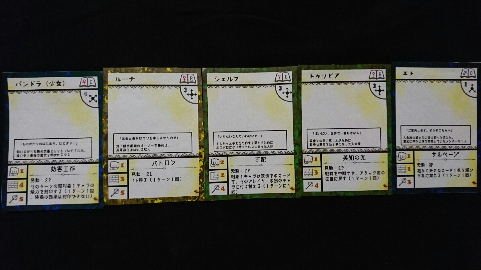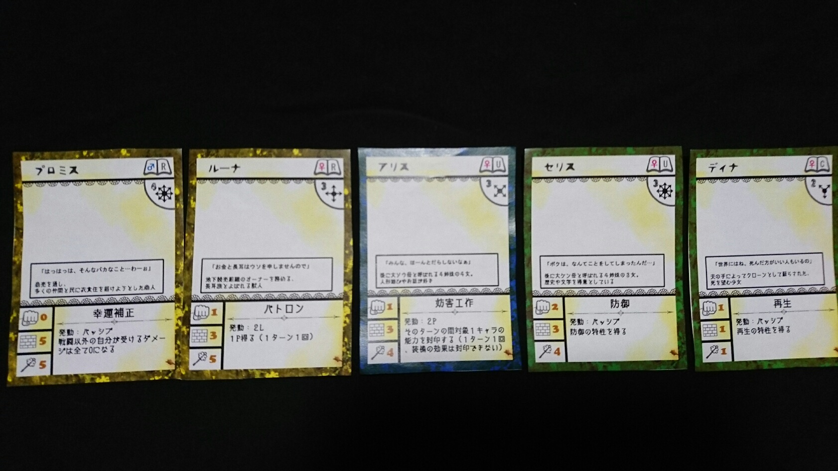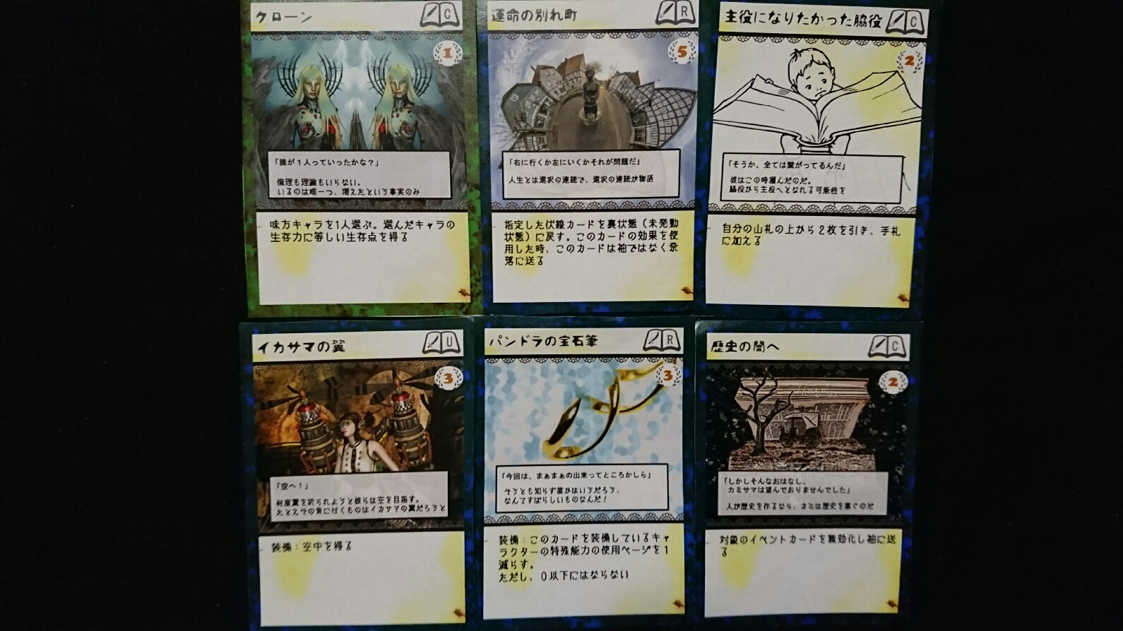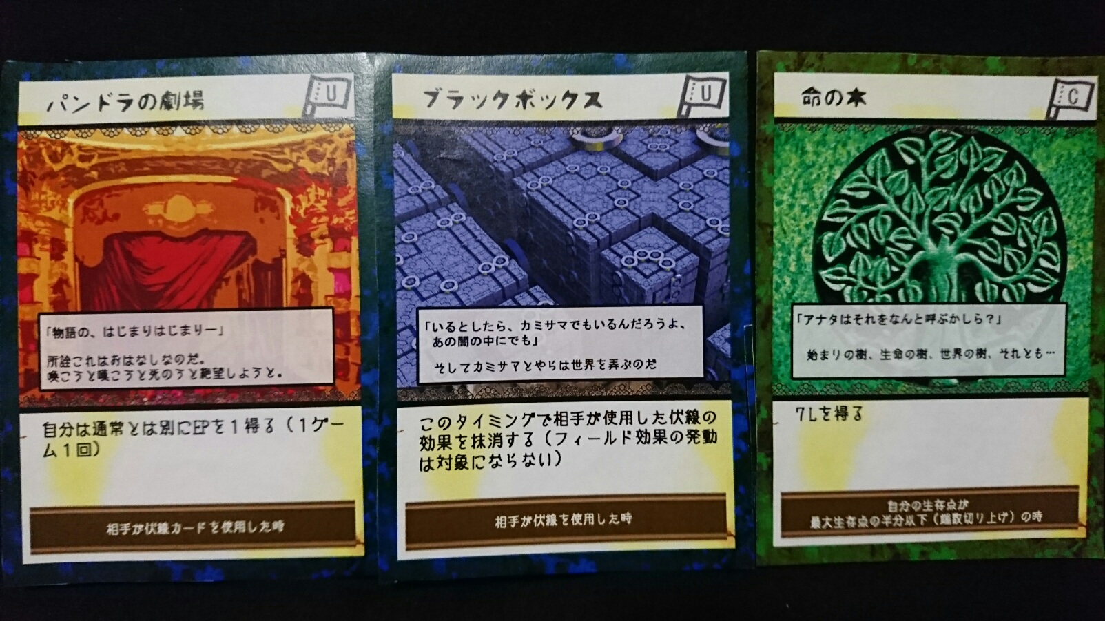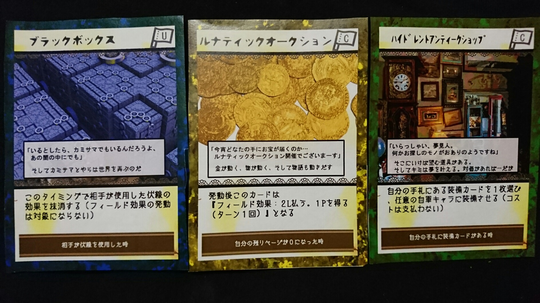 カードゲーム『Deus Ex Ark』 2017/11/27 DEA開発室より 第1回大会参加者プロット その2 大会参加者のプロットをご紹介の続き。(50音順)プロット(デッキ)名『青緑フォーチューン(運命の勇者と樹海)』ライター(作者)名『横溝大希』キャラクターカード フォアシャドゥカード ギミックカード パンドラ童話集6まで待ちきれない、【メテウス】を主役にしたプロット。敵陣最奥到達によるエンディングポイント狙いに特化しています。プロット(デッキ)名『レジスタント』ライター(作者)名『わくらばあずき』キャラクターカード フォアシャドゥカード ギミックカード 「どんな相手にも一定以上の妨害をする」をコンセプトに創られた、超耐久型プロット。相手が動けなくなるまで、ジワジワと追い詰めていきます。~おまけ~今大会の人気カード〇キャラクター【ルーナ】【オークショニア】【姉王】ら、ページを獲得できるカードの採用率が高かったです。やはりページがないと何もできませんので…。〇フォアシャドゥ相手のフォアシャドゥを打ち消せる【ブラックボックス】。フォアシャドゥは効果が強いので、皆さん対策されていた様です。〇ギミックイベントカードを打ち消す【歴史の闇へ】、フィールド操作に長けた【迷いの森】。上記カードに対して同じカードで対処する場面もありました。どんなカードを組み合わせるかは、『シナリオライター』であるアナタ次第―――さぁ、『プロット(デッキ)』を創りましょう!!DEA公式サイトはコチラhttps://d-e-a.theblog.me/