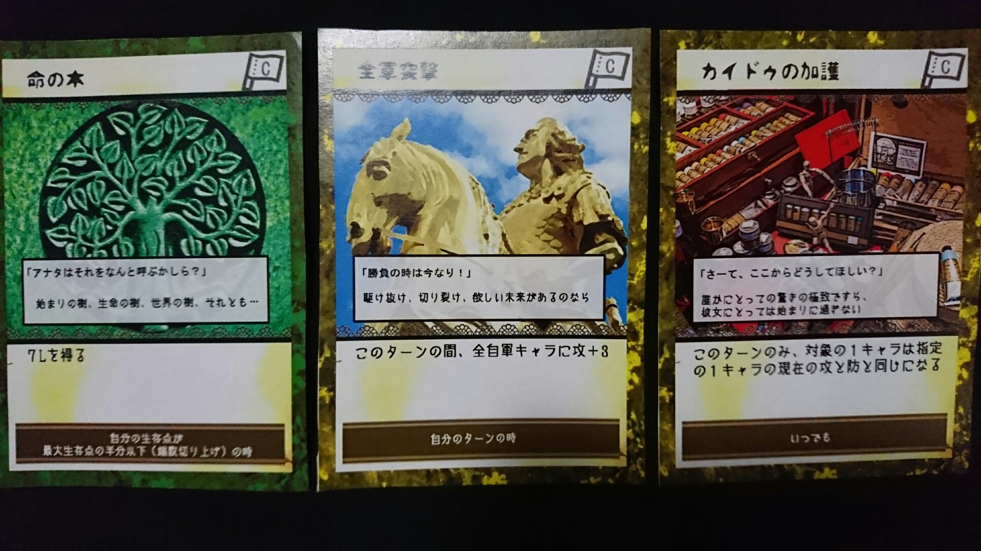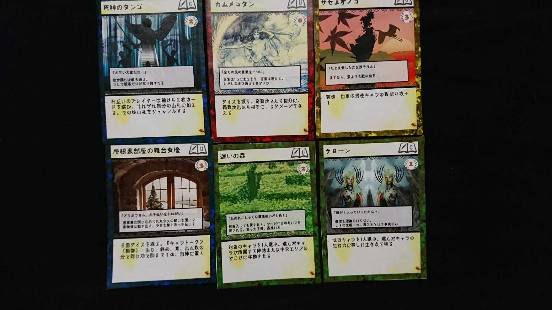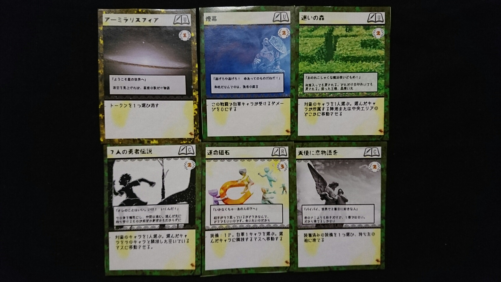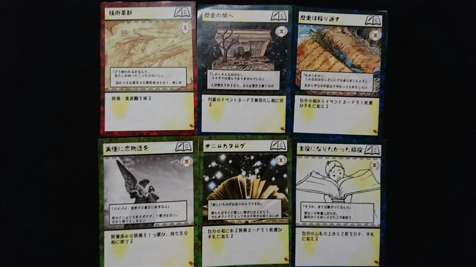 カードゲーム『Deus Ex Ark』 2017/11/27 DEA開発室より 第1回大会参加者プロット その2 大会参加者のプロットをご紹介の続き。(50音順)プロット(デッキ)名『青緑フォーチューン(運命の勇者と樹海)』ライター(作者)名『横溝大希』キャラクターカード フォアシャドゥカード ギミックカード パンドラ童話集6まで待ちきれない、【メテウス】を主役にしたプロット。敵陣最奥到達によるエンディングポイント狙いに特化しています。プロット(デッキ)名『レジスタント』ライター(作者)名『わくらばあずき』キャラクターカード フォアシャドゥカード ギミックカード 「どんな相手にも一定以上の妨害をする」をコンセプトに創られた、超耐久型プロット。相手が動けなくなるまで、ジワジワと追い詰めていきます。~おまけ~今大会の人気カード〇キャラクター【ルーナ】【オークショニア】【姉王】ら、ページを獲得できるカードの採用率が高かったです。やはりページがないと何もできませんので…。〇フォアシャドゥ相手のフォアシャドゥを打ち消せる【ブラックボックス】。フォアシャドゥは効果が強いので、皆さん対策されていた様です。〇ギミックイベントカードを打ち消す【歴史の闇へ】、フィールド操作に長けた【迷いの森】。上記カードに対して同じカードで対処する場面もありました。どんなカードを組み合わせるかは、『シナリオライター』であるアナタ次第―――さぁ、『プロット(デッキ)』を創りましょう!!DEA公式サイトはコチラhttps://d-e-a.theblog.me/