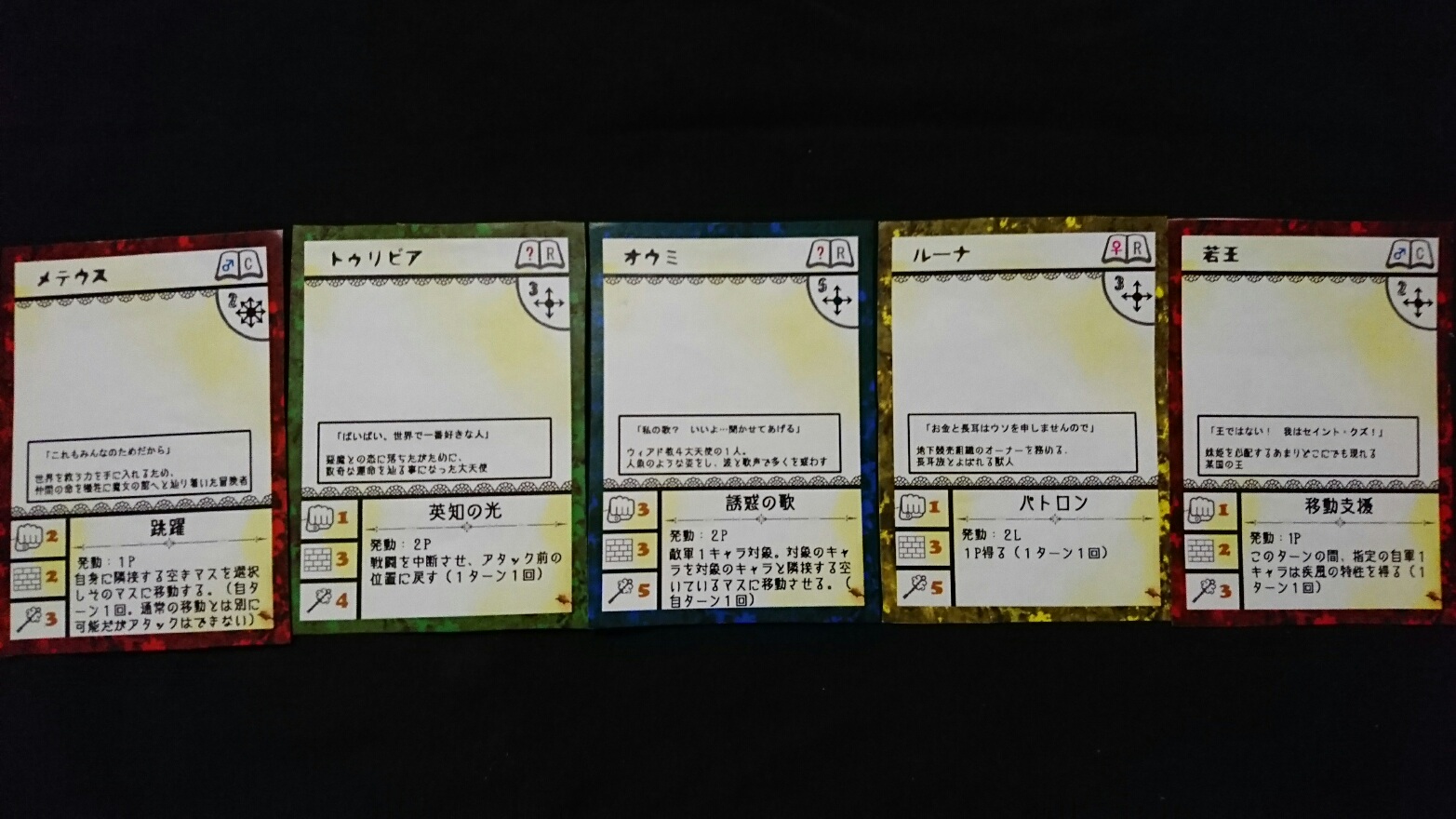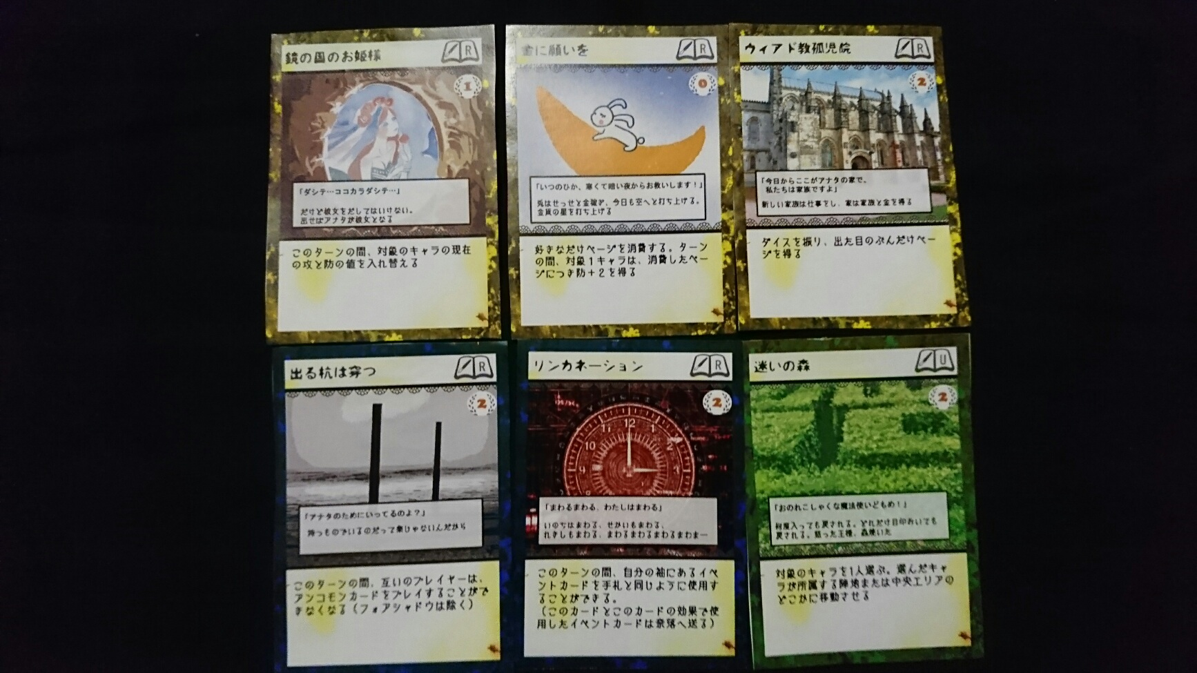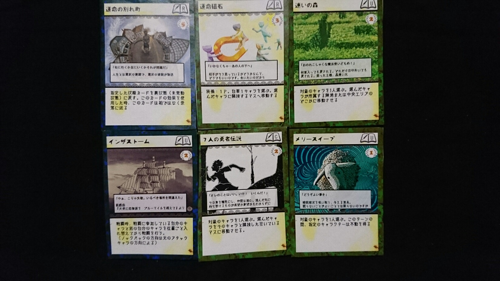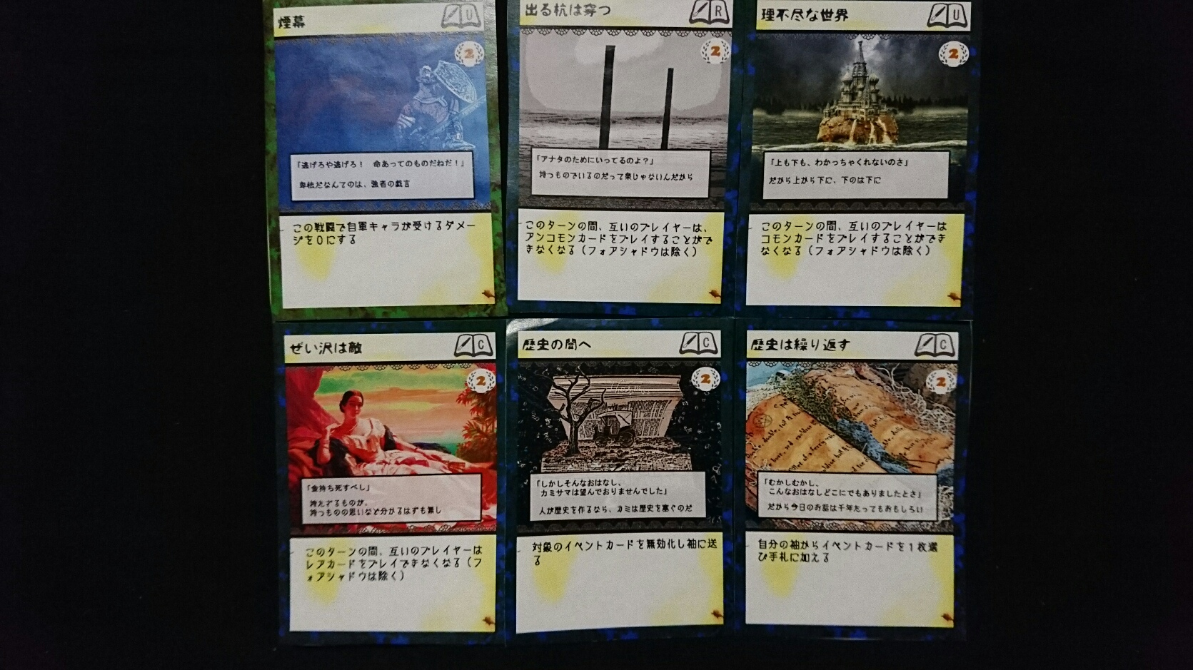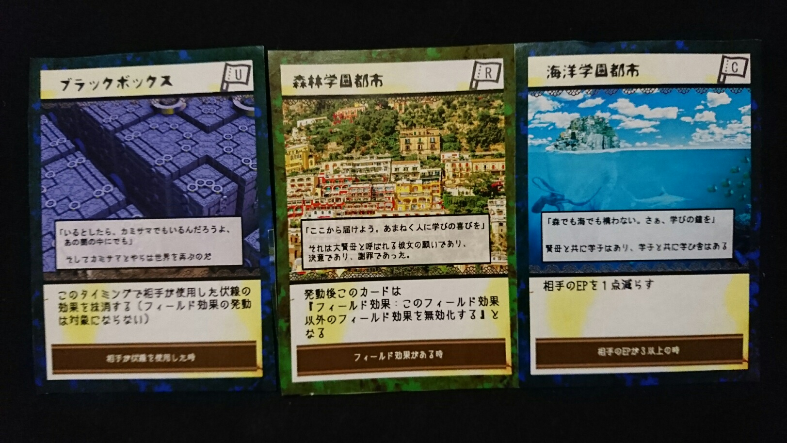 カードゲーム『Deus Ex Ark』 2017/11/27 DEA開発室より 第1回大会参加者プロット その2 大会参加者のプロットをご紹介の続き。(50音順)プロット(デッキ)名『青緑フォーチューン(運命の勇者と樹海)』ライター(作者)名『横溝大希』キャラクターカード フォアシャドゥカード ギミックカード パンドラ童話集6まで待ちきれない、【メテウス】を主役にしたプロット。敵陣最奥到達によるエンディングポイント狙いに特化しています。プロット(デッキ)名『レジスタント』ライター(作者)名『わくらばあずき』キャラクターカード フォアシャドゥカード ギミックカード 「どんな相手にも一定以上の妨害をする」をコンセプトに創られた、超耐久型プロット。相手が動けなくなるまで、ジワジワと追い詰めていきます。~おまけ~今大会の人気カード〇キャラクター【ルーナ】【オークショニア】【姉王】ら、ページを獲得できるカードの採用率が高かったです。やはりページがないと何もできませんので…。〇フォアシャドゥ相手のフォアシャドゥを打ち消せる【ブラックボックス】。フォアシャドゥは効果が強いので、皆さん対策されていた様です。〇ギミックイベントカードを打ち消す【歴史の闇へ】、フィールド操作に長けた【迷いの森】。上記カードに対して同じカードで対処する場面もありました。どんなカードを組み合わせるかは、『シナリオライター』であるアナタ次第―――さぁ、『プロット(デッキ)』を創りましょう!!DEA公式サイトはコチラhttps://d-e-a.theblog.me/