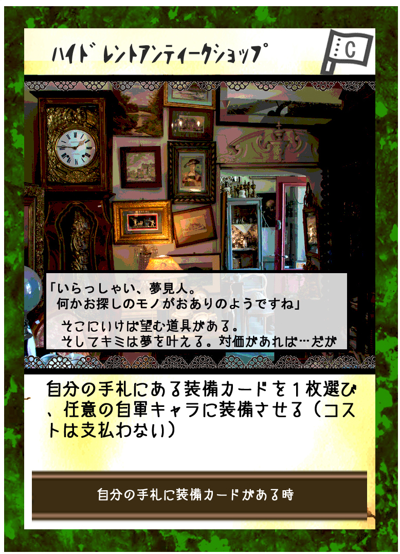 カードゲーム『Deus Ex Ark』 2017/08/07 DEA開発室より≪ハイドレントアンティークショップ≫ 「いらっしゃい、夢見人。何かお探しのモノがおありのようですね」そこにいけば望む道具がある。そしてキミは夢を叶える。対価があれば…だが今回のリクエストは、前回紹介したのプラノのお店、ハイドレントアンティークショップ。それをカードで表現したのがコチラ。 ※画像は開発中のものになります手札にある装備カードを、1度だけノーページで装備出来ます。消費ページが高いほどお得なのは言うまでもありません。現在ある装備カードの最大消費ページは4。条件があるとはいえ、一瞬にして4ページを生成しているとも考えられます。更にこのカードの凄いところは、装備できるタイミングです。本来装備カードは、自分のターンにしか使用出来ません。しかしこの能力なら、相手のターン中にも装備ができることになるのです‼プラノ(山札から装備カードを手札に加える)からハイドレントアンティークショップ使用という流れは、かなり綺麗かと。このカードをどうするかは、『シナリオライター』であるアナタ次第―――さぁ、『プロット(デッキ)』を創りましょう!!DEA公式サイトはコチラhttps://d-e-a.theblog.me/