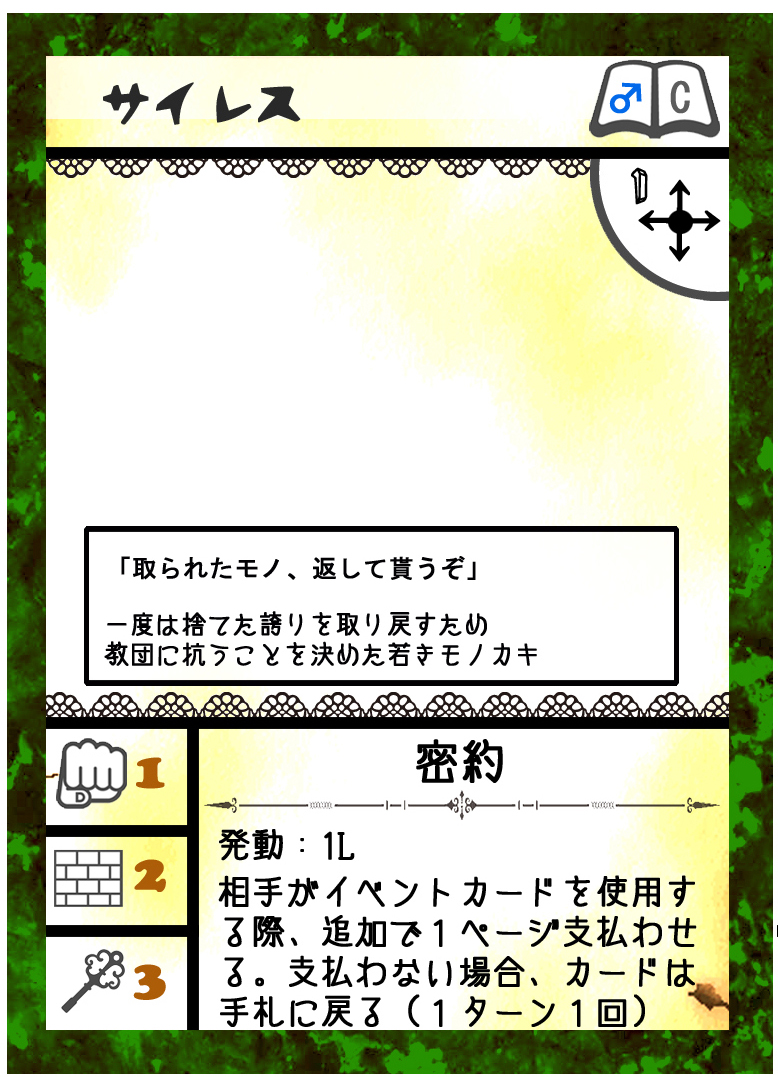 カードゲーム『Deus Ex Ark』 2017/04/19 DEA開発室より≪サイレス≫ 「取られたモノ、返して貰うぞ」一度は捨てた誇りを取り戻すため教団に抗うことを決めた若きモノカキサンドマンの弟子で、コッペリアの兄弟子であるサイレス。その姿をカードで表現したのがコチラ。※画像は開発中のものになります昨年12月の公演後に作られた新規カードの1枚。能力:密約は妨害に特化していますが、代わりにこのカードの戦闘能力は底辺。しかし、コスト1なのでどんなデッキにも組み込むことが出来ます。この能力は、相手の展開速度を遅らせる事が出来ます。相手からしたら、イベントカードの消費ページ+1と変わらないのですから。生存点の消費はあっても、緑色は回復が得意なのでフォローも容易いです。何よりも変換効率が、現状最高値‼黄色の得意とする生存点をページに変換する効果は、大体が2→1交換。それに対して(イベントカード限定ではあるが)、こちらは1→1交換。この1ページの差は大きいです。『2生存点』『手札1枚』『移動1回』『(自然回復待ちなら)1ターン』。自分の1生存点と引き換えに、相手はそれ以上の対価を支払わなければならなくなるからです。これ1枚だけで勝てるカードではありませんが、高コストキャラのお供に添えるとより活かせるのではないでしょうか。このカードをどうするかは、『シナリオライター』であるアナタ次第―――さぁ、『プロット(デッキ)』を創りましょう!!DEA公式サイトはコチラhttps://d-e-a.theblog.me/