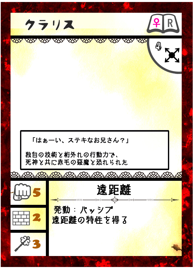 カードゲーム『Deus Ex Ark』 2017/04/02 DEA開発室より≪クラリス≫ 「はぁーぃ、ステキなお兄さん?」独自の技術と桁外れの行動力で、死神と共に赤毛の悪魔と恐れられたマスケット銃のような武器を持ち、ゼロスを支え続けた少女クラリス。その姿をカードで表現したのがコチラ。 ※画像は開発中のものになります高い攻撃力と特性『遠距離』で、まさに赤色といったキャラクター。基礎攻撃力5は現状最高値で、止められるキャラはほぼ居ません。遠距離は、「移動せずに攻撃する」能力。語感から、「1マス先に攻撃する」と勘違いされる方も居ましたのでご注意いを。攻撃寄りの能力に思われがちだが、攻めてきた相手を追い払ったり、ノックバックにより反撃されにくかったりと、実は防御の方が得意だったりする。その反面、こちらから攻める際は移動しない点がネックになることも。気まぐれな彼女同様に、上手に扱いましょう。このカードをどうするかは、『シナリオライター』であるアナタ次第―――さぁ、『プロット(デッキ)』を創りましょう!!