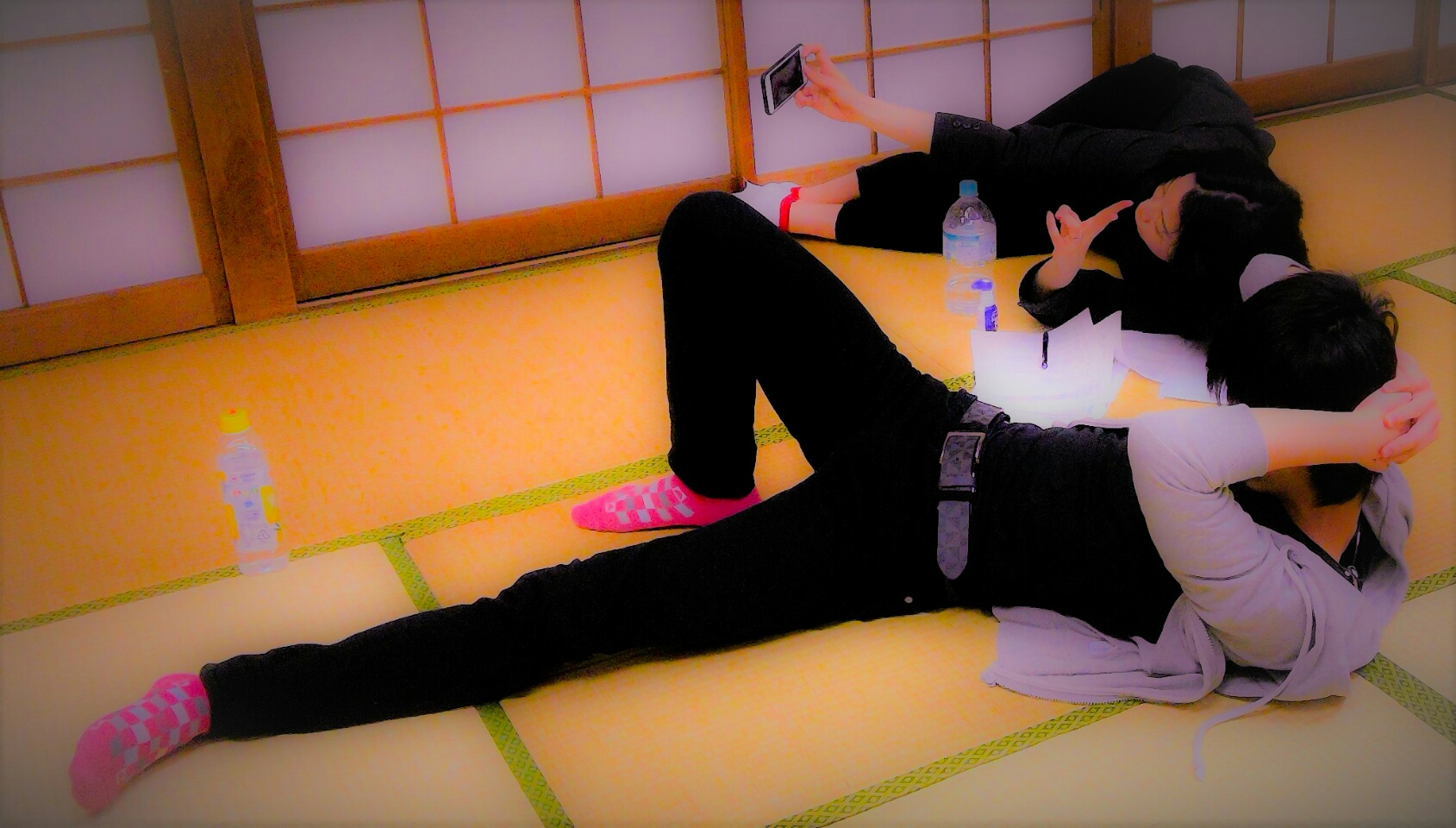 セレクションシリーズ5 2017/04/05 クリミナルフォークロア 【シェルフのお仕事 その2】 失礼いたします。シェルフです。皆様に、もっとたくさんのお写真を!と思っておりましたが、今回はあまりいいお写真がとれませんでした…。頑張りますと申し上げたばかりなのに…、申し訳ございません。しかし、数は少ないですが、何枚かお届けできるお写真もございますので、ご紹介させていただきます。まずはこちら! 今回もお菓子はございます♪こちらはどこかの地方の特産物だそうです。出演者の皆様のご様子はといいますと… 奇妙な格好で、撮影をされたり… 雑誌を読まれたり…と、休憩時間はごゆるりとお過ごしになられ、稽古で疲れた心と体を癒し、気分転換をはかっておられました。お写真を撮っていると写真機をのぞきこんできた方々が… こちらは、出演者の男性陣の皆様!とてもお茶目な方々です。えーと…今回、お届けできるお写真は、これ限り…。少なくて申し訳ありません。振り返ってみると、お稽古をしているお写真が一枚もありませんね…。次回こそは、もっと様々なお写真をお届けできるよう、頑張りたいと思います!それでは皆様、またお会いしましょう。