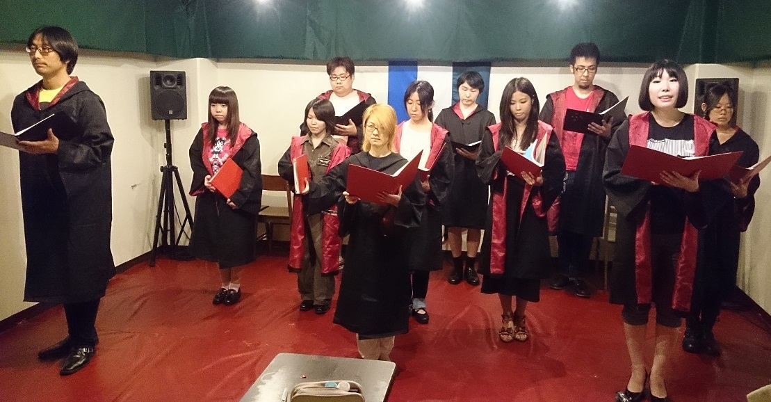 セレクションシリーズ2 2015/08/20 本日より小屋入り! 今週末の金曜はいよいよ本番!予約漏れはございませんか?kazuです! 先日は急遽ラジオの方にも参加させて頂きましてありがとうございました。 ラジオを聴いて下さっているお客様は勿論の事、まだ聞いたことの無いお客様も是非一度ラジオの方も聞いてみて下さいね♪ ラジオは、 毎週火曜22:00~Project Pandoraラジオ企画 【Pando-Radio-R】 ニコ生放送 http://com.nicovideo.jp/community/co2724123 … … で配信しております。 TOMOさんとわくらばさんがメインとして配信しております。 こちらもよろしくお願い致します! さて今日から当日お世話になります「ウサギ亭」さんにて稽古が行われました。 舞台を整えて、衣装を確認して、当日に向けていよいよ皆さんの足並みも揃い、今なら11人12脚レースにも出れそうなくらいです!( ゚Д゚)<クワ‼ 写真は主題【レポートノーツ】より1コマ。 皆さんの真剣な表情が伺えますね。 そんな中今日の鮭さんが稽古中にボソッと 「フォリィ…sorry…」 何て思わず呟き、みんなを笑いに誘っていました。 毎回ネタが飛び出す稽古も明日でいよいよ最後! 皆さん全力を出し切って本番に臨みましょう! 皆様を当日お待ちしております! それではまた次回の更新で!
