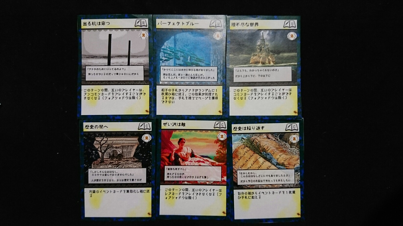 カードゲーム『Deus Ex Ark』 2017/10/13 DEA開発室より サンプル青緑 ~サンプルデッキ 青緑~〇コンセプト相手の妨害や駆け引きを、とにかく楽しみたい人向け青の打ち消しや緑の回復・戦闘回避など、耐久性は最高値ですダメージによる勝ち手段を捨て、完全にEP狙いのデッキですカードは基本的に相手ターンにのみ使用するので、自ターンはカードを引いて終了なことも多々あります(いわゆる「ドロー・ゴー」戦法)〇デッキ紹介キャラクターカード フォアシャドウカード ギミックカード 〇使い方ギミックだけでなくフォアシャドウやキャラクターも妨害カードばかりなので、条件や能力の把握は必須になります妨害する際は、相手の消費ページ数や消費カード数が自分よりも多くなる様に計算しましょう相手の手段がなくなるまで捌き、その後ジワジワとEPを狙いにいきます【出る杭は穿つ】【理不尽な世界】【ぜい沢は敵】は、相手のギミックカードを打ち消す用途が多いです上記3つはキャラクターにも使用可能(移動や能力の打ち消し、攻撃や呪文から対象不可にする)ですが自分にも影響が出ますので、ご利用は計画的に【オウミ】の誘惑の歌は、自キャラの移動手段に使っても良いです10月の集会は15日と29日で、共に13:30開始です。ご参加を希望される方はお手数ですが、運営までご連絡下さい。メール projectpandora_info@yahoo.co.jpDEA公式サイトはコチラhttps://d-e-a.theblog.me/ PR