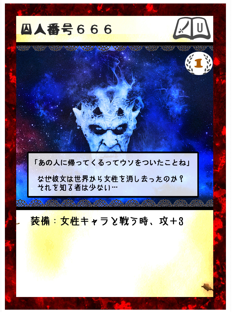 カードゲーム『Deus Ex Ark』 2017/06/10 DEA開発室より≪囚人番号666≫ 「あの人に帰ってくるってウソをついたことね」なぜ彼女が世界から女性を消し去ったのか?それを知る者は少ない…パンドラ童話集5の要となる(予定の)物語、囚人番号666。それをカードで表現したのがコチラ。 ※画像は開発中のものになります特定の条件下のみで効果があるカードは、使いづらい反面強力だったりします。このカードもその典型で、女性にしか効きませんが消費ページ1で攻+3と破格です。ダメージの底上げからアタッカーへの牽制まで、決まれば器用にこなしてくれます。相手のデッキに高く依存しますが、DEAの強キャラは女性のことが多いので使用頻度はそこそこありそうです。ただし、?の性別にはご注意を。公演や小説からのイメージで女性だと思っていたら、実は性別?でしたなんてこともありますので…。使いたい相手が居ない場合は、素直にページ変換しましょう。このカードをどうするかは、『シナリオライター』であるアナタ次第―――さぁ、『プロット(デッキ)』を創りましょう!!DEA公式サイトはコチラhttps://d-e-a.theblog.me/ PR